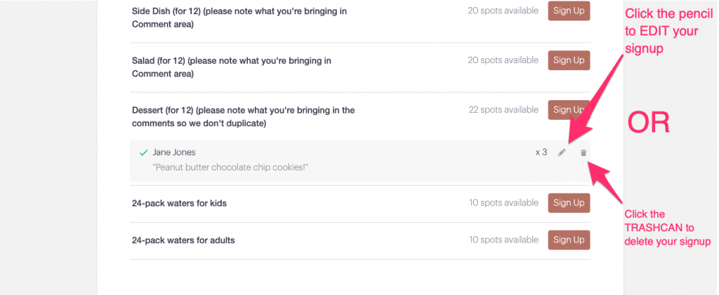 Click on the PENCIL to EDIT your signup, or click on the TRASHCAN to DELETE your signup.
